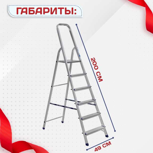 Изготовлена из высококачественного алюминиевого сплава. Представляет собой свободностоящую переносную лестницу. Широкая рабочая площадка прочно фиксирует стремянку в разложенном положении. Для придания жесткости конструкции передние ноги соединены между собой. При высоте стремянки свыше 5 ступеней модели комплектуются дополнительными стяжками безопасности.