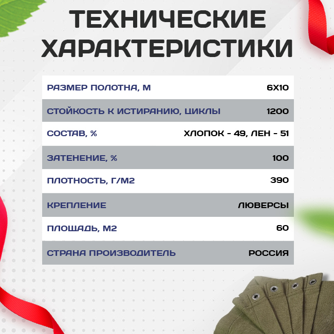 Полог из брезента изготовлен из натуральных материалов, таких как лен и хлопок, имеет защитную пропитку, увеличивающую его защитную функцию и продлевающую срок эксплуатации. Металлические кольца для крепления обеспечивают удобный монтаж, равномерное натяжение, предотвращают разрывы по краям.